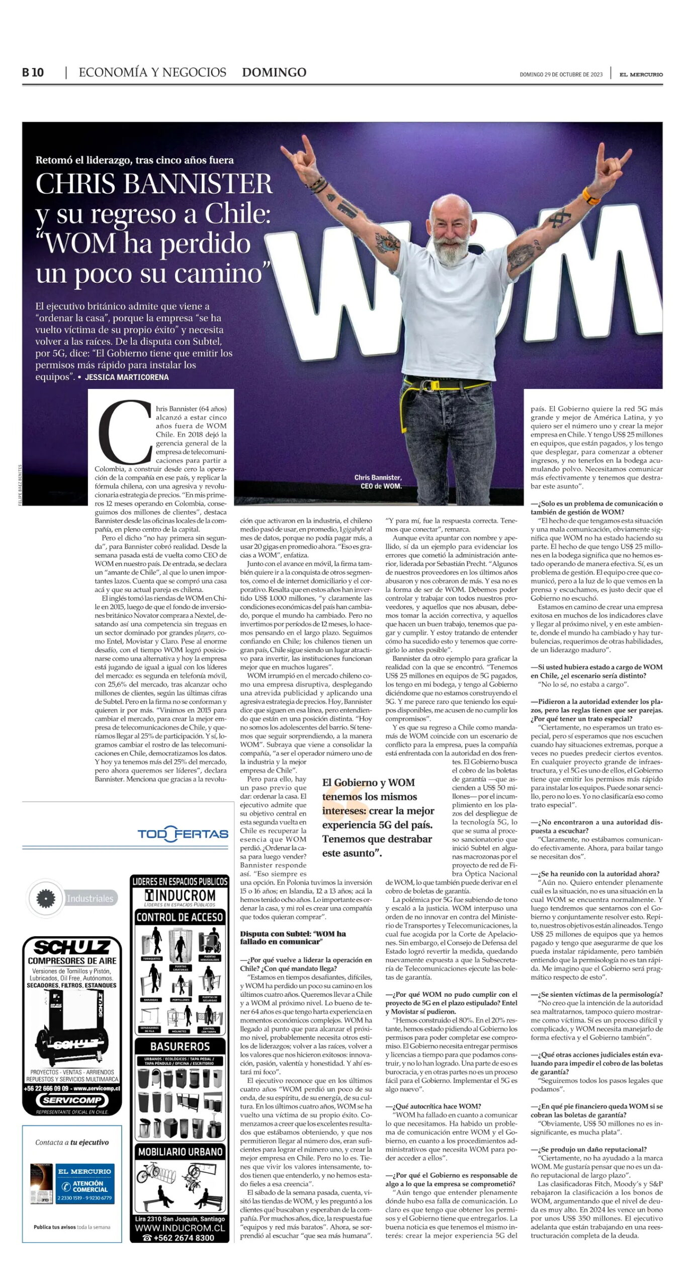 Pero el dicho ‘no hay primera sin segunda’, para Bannister cobró realidad. Desde la semana pasada está de vuelta como CEO de WOM en nuestro país. De entrada, se declara un ‘amante de Chile’, al que lo unen importantes lazos. Cuenta que se compró una casa acá y que su actual pareja es chilena.