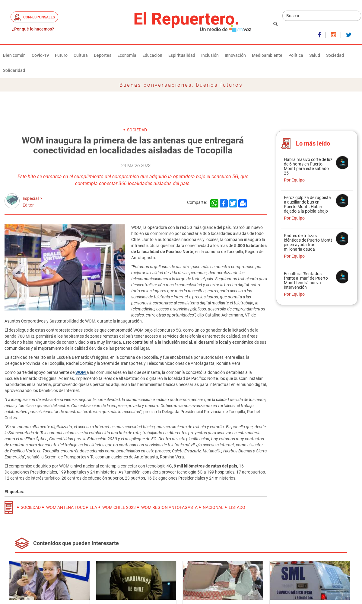 WOM, la operadora con la red 5G más grande del país, marcó un nuevo hito en su compromiso por conectar a 366 localidades aisladas de todo Chile. Junto a autoridades nacionales y locales, la compañía inauguró la infraestructura que brindará conectividad a los más de 5.000 habitantes de la localidad de Pacífico Norte, en la comuna de Tocopilla, Región de Antofagasta.